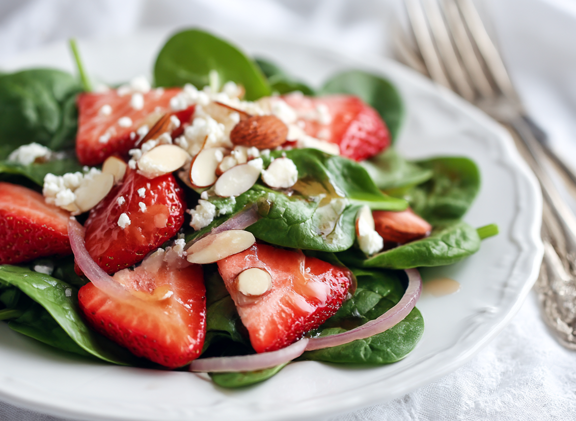 Strawberry spinach salad with baby spinach, fresh sliced strawberries, crumbled goat cheese, sliced almonds, and shaved red onion with a strawberry balsamic dressing