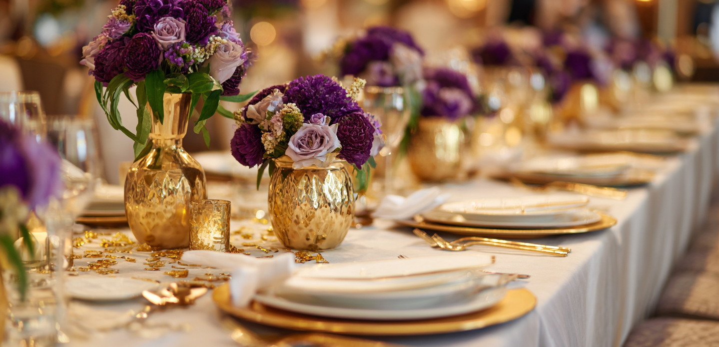 Each Table will be elegantly set with white linen, colored overlays, china, flatware and glassware