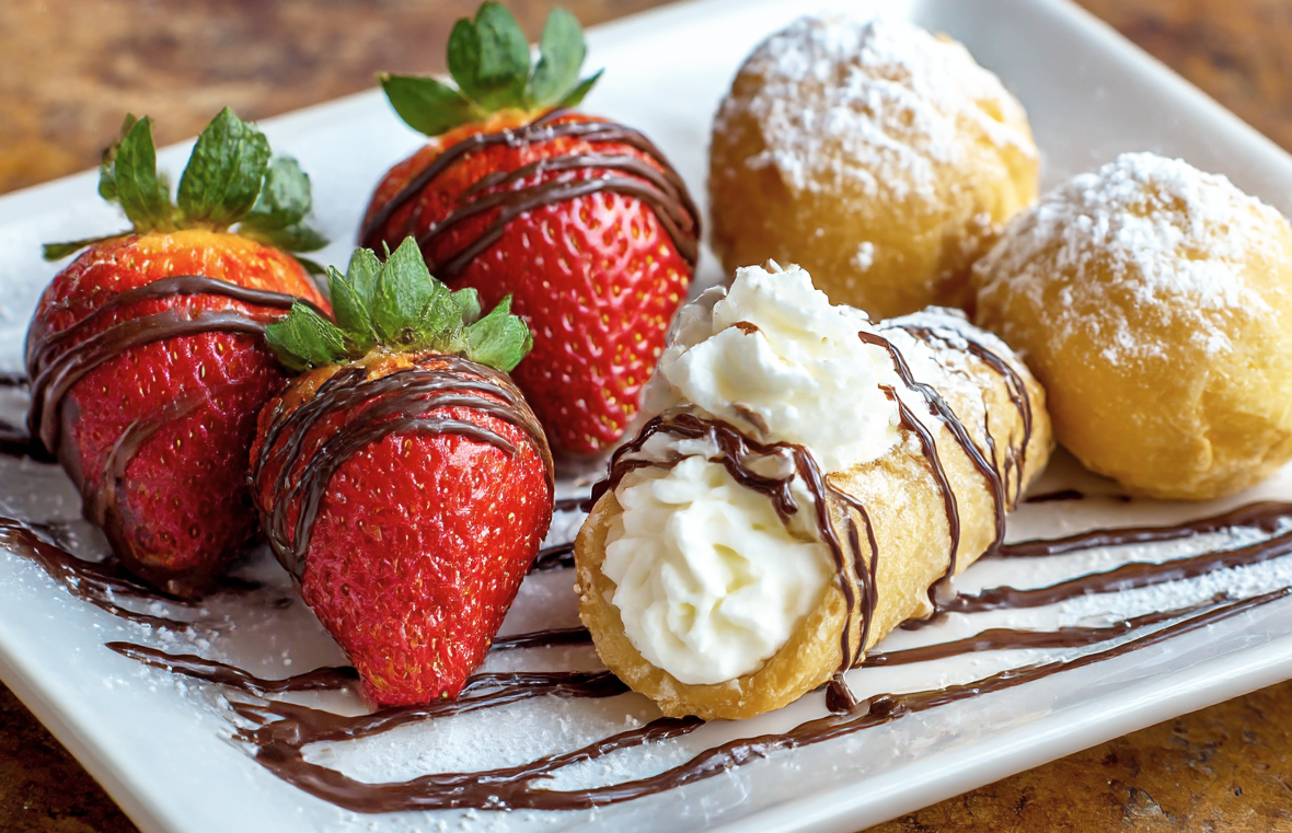 Enjoy assorted mini desserts including cheesecake, chocolate dipped strawberries, cream puffs and cannoli