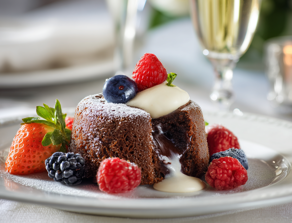 Molten lava cake with a warm, melted chocolate center garnished with vanilla bean crème and fresh berries