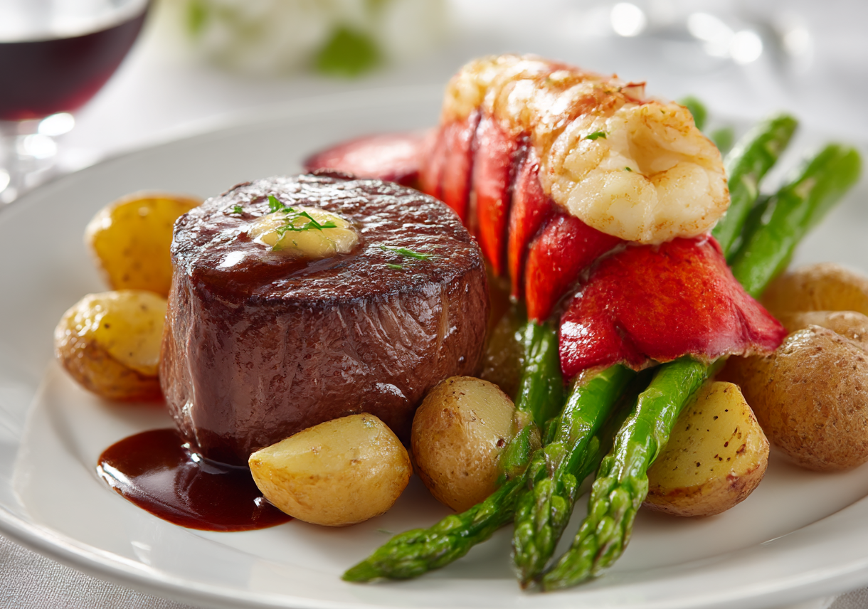 Celebrate your milestone with a beautifully curated five-course dinner designed to feel indulgent and unforgettable. Your tables will be dressed in elegant linens with full china, glassware, and flatware, setting the stage for an evening of romance and refined flavor. Guests will enjoy fresh seasonal starters, vibrant salads, and a rich, handcrafted risotto before savoring a show-stopping surf-and-turf entrée featuring tender filet mignon and Maine lobster. The night ends on a sweet note with a warm molten chocolate cake and a complimentary champagne toast. Fresh baked rolls, coffee, and hot tea service are included.