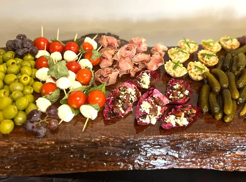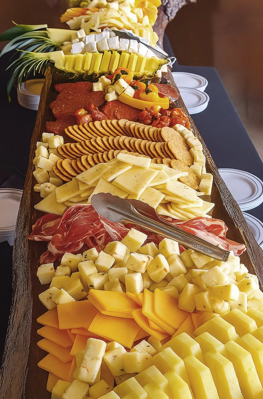 Bring a touch of elegance and abundance to your event with our beautifully styled charcuterie and grazing displays. Each station features an artful assortment of fine meats, cheeses, crackers, and seasonal fruits all presented on live-edge wooden boards or sleek gray slate surfaces.