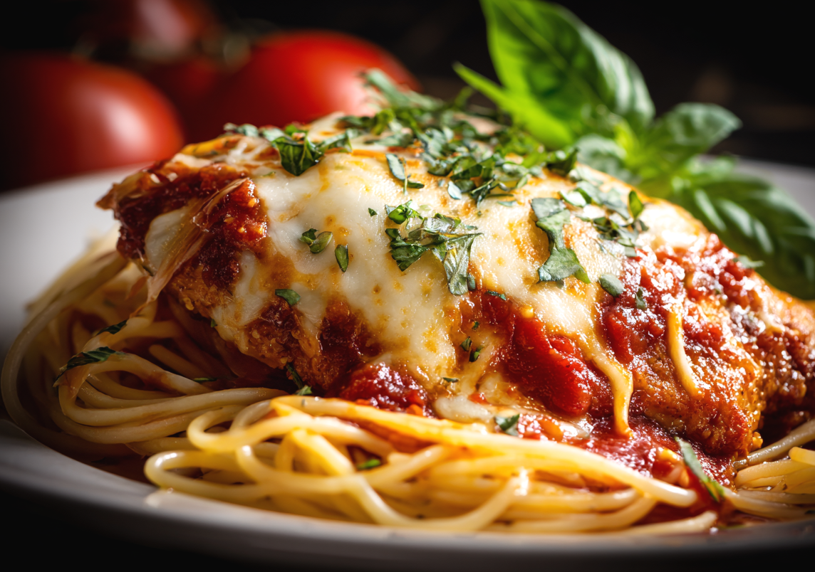 Chicken Parmesan: Hand-Breaded Chicken topped with Marinara Sauce and Mozzarella