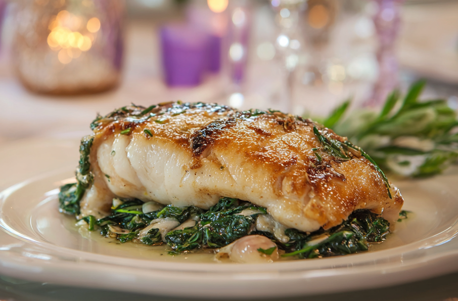 Stuffed Filet of Flounder: Broiled Filet of Flounder stuffed with Sautéed Spinach and Garlic