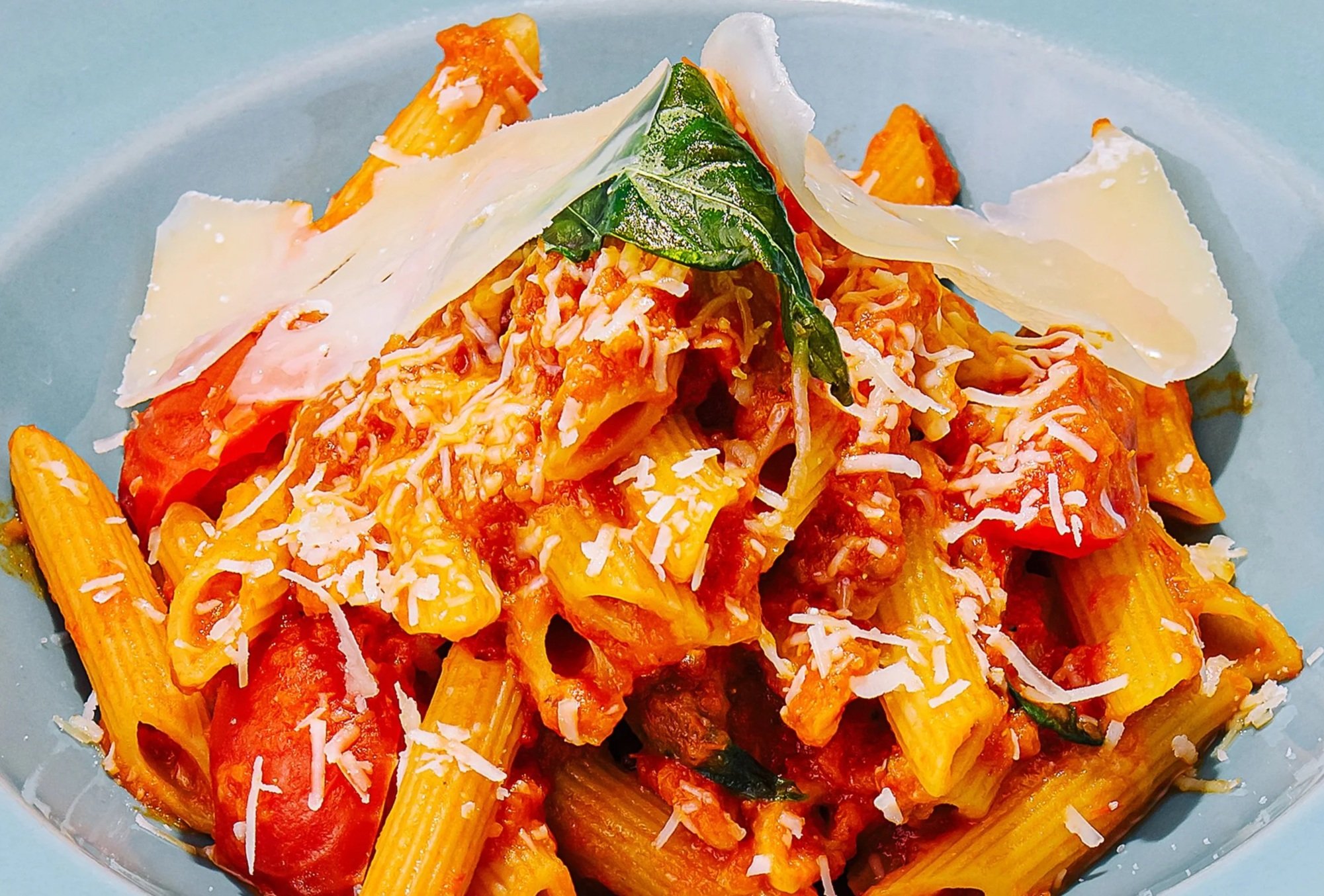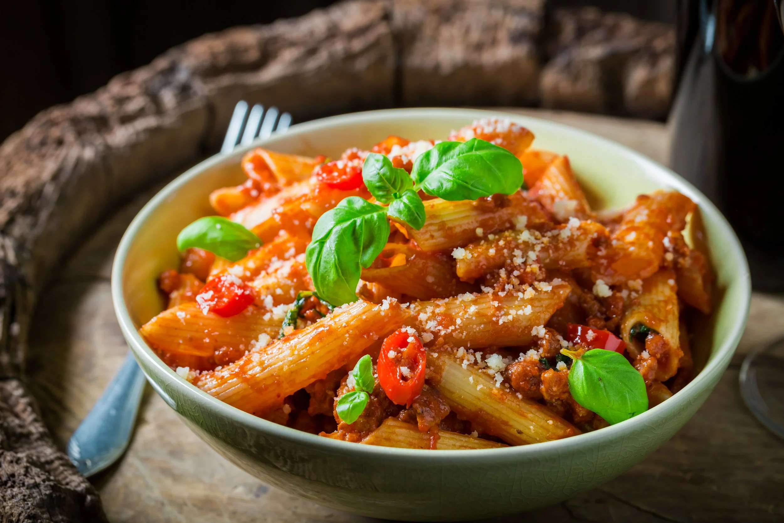 Whole Wheat Penne Pasta tossed with Cherry Tomatoes and Sweet Basil Pesto
